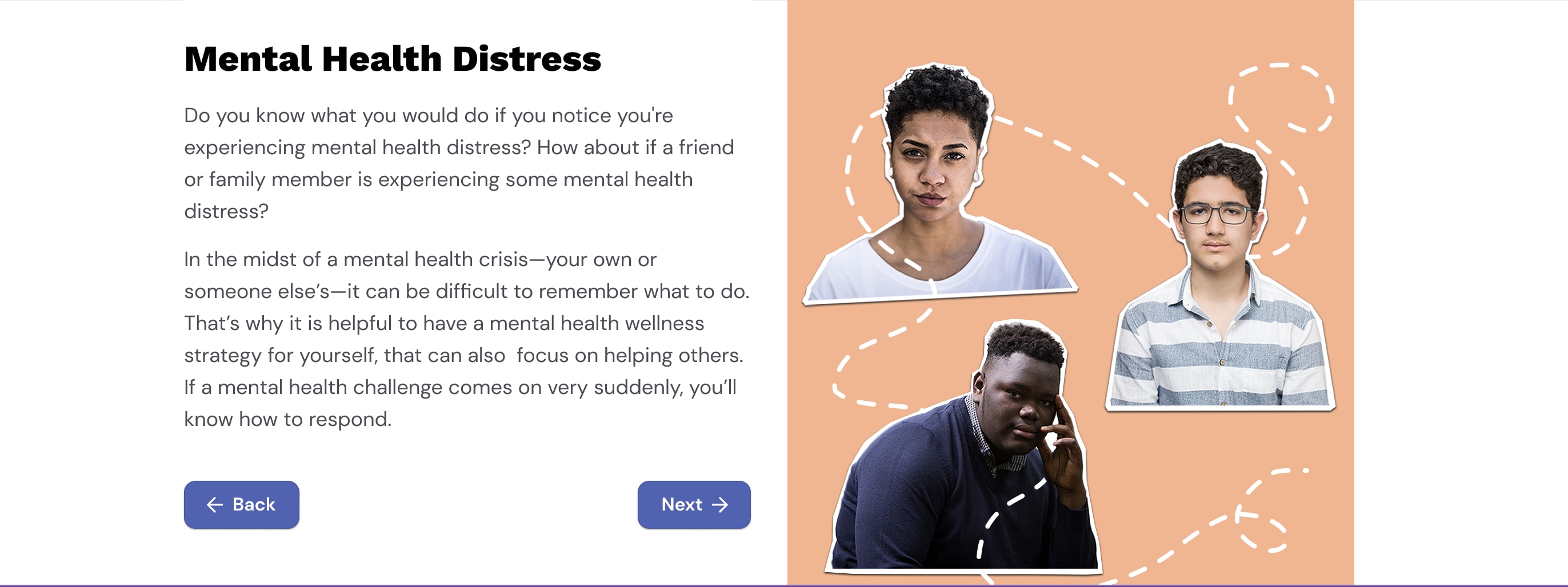 Students are introduced to the topic of mental distress and the ways in which they can implement coping strategies to manage their own challenging thoughts, feelings, and behaviors. Students will also learn how to support friends and family who may be struggling, how to recognize when to seek help, and how to access appropriate resources.